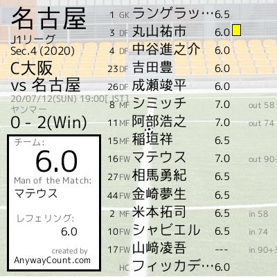 1-0で勝利。前半は守備的に噛み合った試合だったが、後半名古屋の前田の投入、鳥栖のリャン・ヨンギが交代した辺りから名古屋ががっちり主導権を握り、阿部の絶妙のループパスから前田のボレーシュートで先制し、…