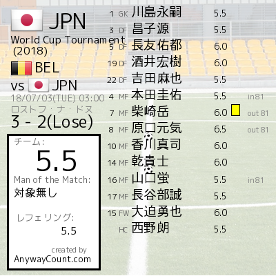 ファインゴール2発で先行するも、ベルギーの反撃を許し逆転負けの2-3。優勝候補相手に勝てる可能性を感じさせる展開で、負けた試合ではあるが、この4年間の日本代表のベストマッチ。 後半早々、柴崎の絶妙のス…