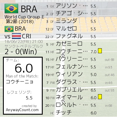 ナバスの神憑りのセービングに苦しみ続けたブラジルが最後の最後にゴールをこじ開け辛勝。 コスタリカは徹底的に走り続け前半は、ブラジルを追い詰めた。ブラジルもエンジンの掛かりが悪く、前半はほほぼノーチャン…