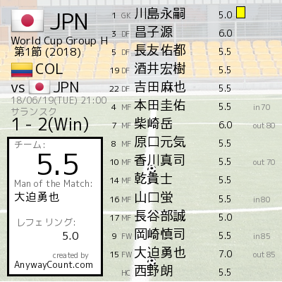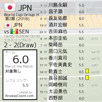 数的優位をきっちりと活かして2-1で勝利。初戦の序盤という最も波に乗るのに失敗するタイミングにコロンビアが痛恨のミスでPK獲得。コロンビア寄りの判定とFKの相手キッカーのアイディアと度胸で一時同点に追…