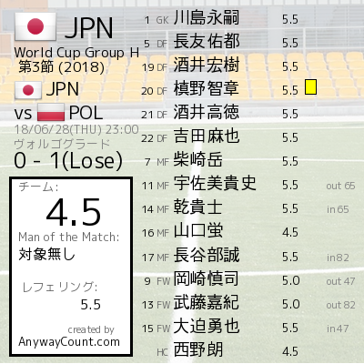 0-1で敗戦ながら決勝トーナメント進出は勝ち取った。ただ最後の戦い方はホントがっかり。現実的な戦い方なのかもしれないが、イエローカードの差というほんとの紙一重の進出決定。 先発メンバーを見た時に良い予…